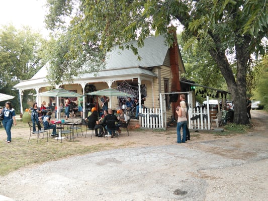 I suggested we head for Homestead first. This is a small house with two rooms, a front porch, a side patio, and tables in the front yard (in the picture, obviously decorated for Hallowe'en). The actual winery is further north, this is just a venue for serving and selling their wines as well as some of the other wines of North Texas. Homestead has carried a wonderful sparkling (Celebration) in the past, but they ran out in the winter. I was hoping they had gotten more. They had not, but were still hopeful. Since we have a club membership there, we sat down and sampled the two new wines they had, then ordered a glass each of our favorites.